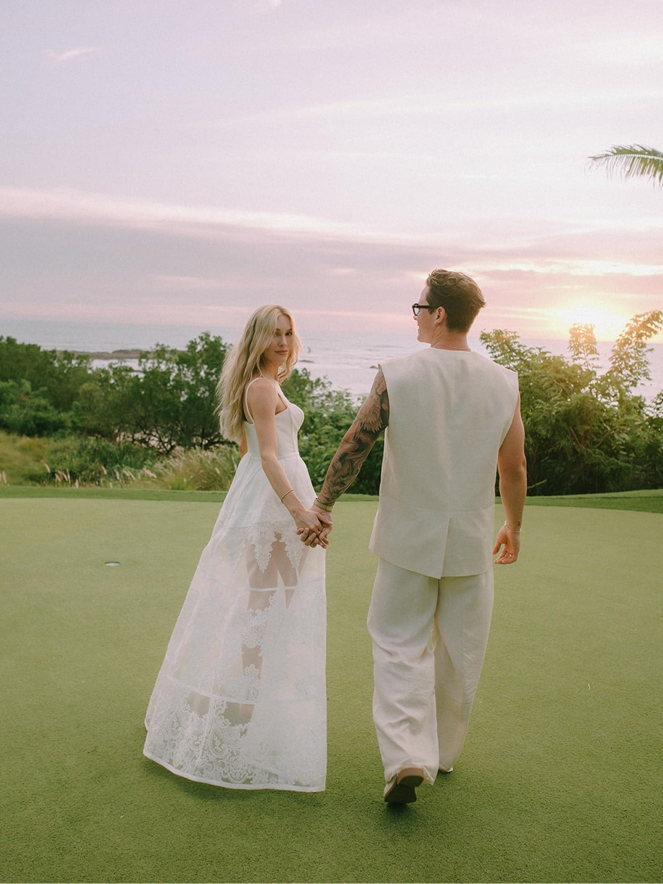 The gown features a lingerie-inspired bodice paired with delicate sheer detailing that instantly elevates its romantic charm. Crafted in fluid crepe, the sleeveless silhouette showcases a sweetheart neckline, a fitted waist, and a classic A-line skirt that moves with a graceful, soft flounce. Embroidered motifs scattered across sheer layers add dimension, while her shimmering lace-trimmed veil brought a touch of ethereal sparkle. It was the ideal look to welcome guests into a weekend of celebration—refined, warm, and beautifully feminine.