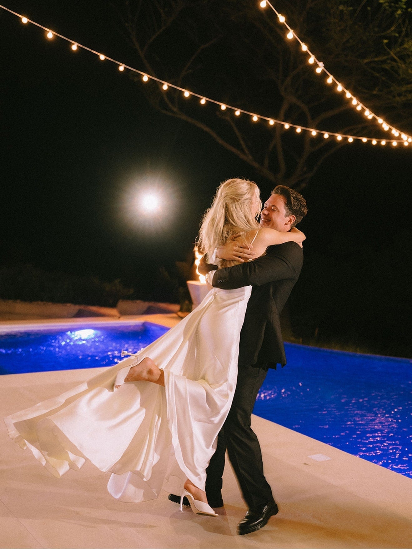 Cassie ended the night on a high note with a playful transformation: the Pronovias Sting mini dress. Crafted in sleek Mikado, this A-line mini brought a fresh, celebratory energy to the dance floor. Its clean silhouette and chic structure created the perfect bridal-after-party moment—flirty, modern, and ready for movement.